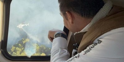 Gobernador Armenta sobrevuela incendio en Sierra Negra poblana; está controlado en 70%