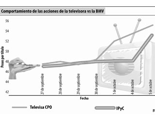 Durante la jornada del martes, el precio de las acciones de la televisora, que adquirió una participación de la empresa estadunidense Univision, llegó a 53.61 pesos por acción, lo que implicó un alza de 12.34 por ciento, representando casi 18 por ciento del volumen negociado ayer en el mercado de valores.