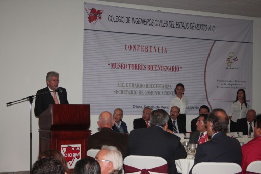 Ante los miembros del Colegio de Ingenieros Civiles del Estado de México, empresarios del ramo el Secretario de Comunicaciones, Gerardo Ruiz Esparza, dio una conferencia magistral para explicar el cómo y el por qué de las Torres Bicentenario que se encuentran en la entrada oriente de la Ciudad de Toluca.