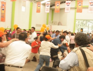 Testigos apuntaron que en esos momentos un grupo de personas lideradas por Gabriel Hernández Camacho, suplente de Máximo Flores, tomaron las sillas del lugar para aventarlas y golpear a los simpatizantes del ex diputado local Roberto Río Valle, quien tomó protesta como presidente del CEM de Convergencia.