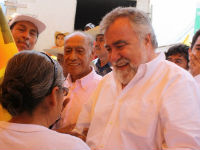 Al escenario, después del desfile por el pasillo central, Encinas llegó arropado por la multitud de hombres y mujeres humildes que ondeaban cientos, miles de banderas anaranjadas, del partido Convergencia, uno de los que integran la coalición “Unidos podemos más”. El candidato tuvo una colorida recepción. Antes de llegar al templete, los anfitriones le colocaron un collar hecho con galletas Marías, bombones, dulces y popotes, en sustitución del tradicional pan que antes elaboraban.