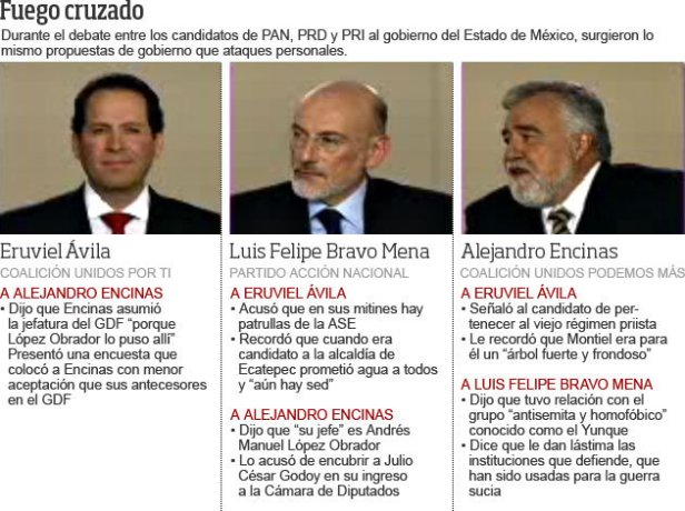 Entre descalificaciones y acusaciones mutuas, los candidatos a la gubernatura del Estado de México, Eruviel Ávila, de la coalición “Unidos por ti”; Alejandro Encinas, de “Unidos podemos más” y Luis Felipe Bravo Mena, del PAN, participaron en el primer debate público organizado por el Instituto Electoral del Estado de México (IEEM), en el que además de protagonizar ataques personales —en los que salieron a relucir figuras como el ex gobernador Arturo Montiel y Andrés Manuel López Obrador—, se comprometieron a abrir sus cuentas bancarias y someterse a exámenes antidoping.