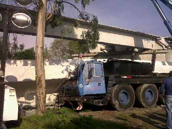 La grúa con placas 197-DH-1 de la empresa ‘Transportes y Grúas industriales TYGSA’ resultó afectada por la trabe, la cual realiza el levantamiento para colocarlas en la estructuras.