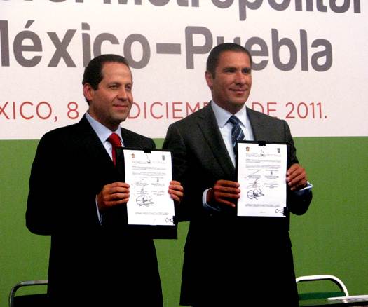 CCO.- El Gobernador del Estado de México, Eruviel Ávila Villegas y el Gobernador de Puebla, Rafael Moreno Valle Rosas, firmaron el Acuerdo de Coordinación y Colaboración Intergubernamental Metropolitano durante el Encuentro Bilateral Metropolitano Edomex-Puebla.
