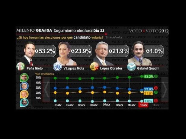 El porcentaje de indefinidos también muestra una disminución, pues pasó de 33.5 por ciento 30 de marzo el pasado, a 24.7 por ciento este miércoles.