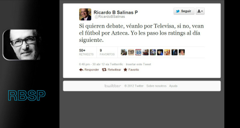 El lunes pasado, el dueño de la TV Azteca respondió @RicardoBSalinas: «Si quieren debate, véanlo por Televisa, si no, vean el fútbol por Azteca. Yo les paso los ratings al día siguiente.»