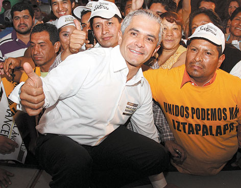 Ante hombres y mujeres con niños en brazos que portaban playeras con la leyenda “Decidamos Juntos”, su lema de campaña, agitaban sus banderas y gritaban: “Mancera, Mancera”.