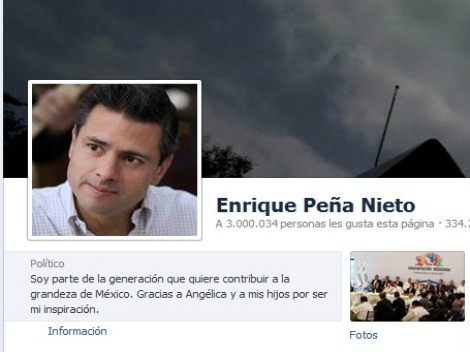Ciudad de México • Enrique Peña Nieto, candidato del PRI a la República, se convirtió en el primer político mexicano en superar los 3 millones de seguidores en su página de Facebook. El perfil del ex gobernador del Estado de México -EnriquePN-, quien se unió a la red social el 5 septiembre 2008, cuenta hasta el momento con “me gusta”.