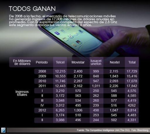Pero hablando en dinero, ¿cuánto puede generar la banda de los 2.5 Gigahertz? La estimación también la tiene The CIU: en el mediano plazo, 5 años máximo, este espectro por sí mismo estaría generando una cifra similar a lo que todo el mercado de las telecomunicaciones móviles generó en el segundo trimestre de 2012: 4,331 millones de dólares.
