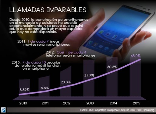 Es decir, para 2015, sumando sólo los 68 millones de smartphones y las 12 millones de tabletas, habrá un potencial mercado de 80 millones de dispositivos que demandarán ancho de banda, y el cual ahora mismo ya es un apetecible negocio para las telefónicas. Todo sin contar que para ese año habrá cuando menos 70 millones de celulares de gamas más bajas, 15 millones de laptops, 5 millones netbooks y demás equipos que también demandarán en algún momento servicios de datos.