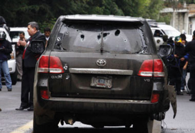 Fotografías de la camioneta Toyota, un modelo que es conocido por ser utilizado por agentes de la agencia antinarcóticos estadounidense (DEA, por sus siglas en inglés) y otros empleados de la embajada de ese país en México, mostraron que había recibido disparos de armas de alto poder.