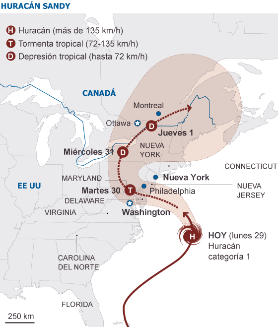Se repite así la situación vivida hace poco más de un año con Irene, pero en aquella ocasión el impacto de la tormenta se sintió en domingo y esta vez afectará a la ciudad en plena jornada laboral, en el arranque de la semana y a solo ocho días de las elecciones presidenciales. Los colegios públicos permanecerán cerrados este lunes. Naciones Unidas ha informado también en una nota de que todas as actividades previstas para mañana martes en la sede del organismo también quedan suspendidas. Los periódicos The New York Times y The Wall Street Journal, por su parte, han levantado el peaje de sus webs en las informaciones relacionadas con la tormenta.