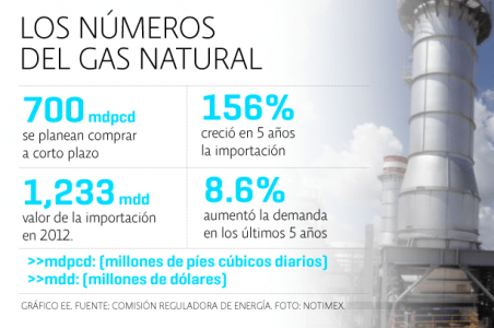 Las importaciones de gas han aumentado 156% en los últimos cinco años, en 2008 se compraba en el exterior un promedio de 447 millones de pies cúbicos diarios, en el 2012 se cerró con un promedio de 1,089 millones de pies cúbicos por día y en lo que va del año se ha importado 1,224 millones de pies cúbicos diarios en promedio, según Pemex.
