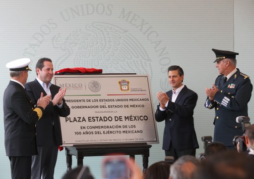 Antes, el Presidente de la República encabezó la inauguración de la de la Plaza Estado de México, en el municipio de Cuautitlán Izcalli, dedicada al Ejército y la Fuerza Aérea Mexicana, y canceló el timbre postal conmemorativo al Centenario del Ejército Mexicano.