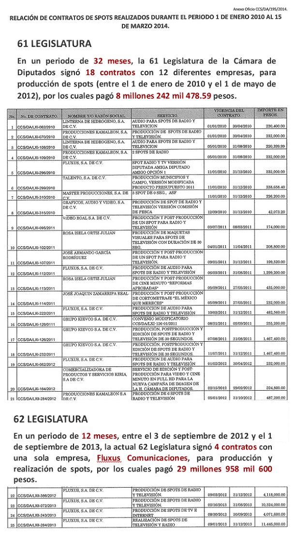 Además, mientras en la Legislatura 61 la Cámara de Diputados contrató a 12 diferentes empresas para el trabajo de producción de spots, en la actual 62 Legislatura sólo ha contratado a una empresa, “Fluxus S. A. de C. V, cuyo nombre comercial es Fluxus Comunicaciones. Todos los contratos se autorizaron y cargaron a la partida de Comunicación Social.
