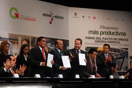 El titular de la Secretaría del Trabajo y Previsión Social (STPS), Alfonso Navarrete Prida y el gobernador del Estado de México, Eruviel Ávila, atestiguaron la ratificación del Pacto de Unidad Obrero-Sindical para la Estabilidad, Productividad y Paz Laboral.