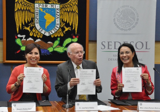 Con el fin de avanzar en el trabajo de fomento y promoción de la actividad artesanal, el Rector de la Universidad Nacional Autónoma de México (UNAM), José Narro Robles, y la Directora General del Fondo Nacional para el Fomento de las Artesanías (Fonart), Liliana Romero Medina, firmaron este mediodía un convenio de colaboración, con el testimonio de la Secretaria de Desarrollo Social, Rosario Robles Berlanga.
