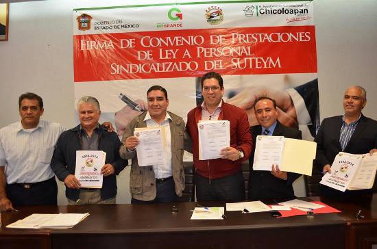 Andrés Aguirre Romero, Presidente Municipal de Chicoloapan, recibió en el Palacio Municipal al Secretario General del SUTEYM, Jorge Omar Velázquez Ruíz, para celebrar la Firma del Convenio de Sueldo y Prestaciones 2014, que generó un incremento salarial global del 11%, el cual impactará a los sindicalizados y a sus familias.