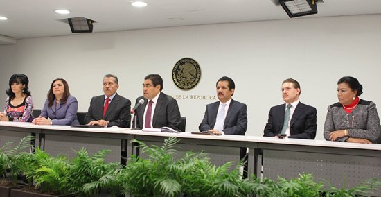 A la conferencia de prensa, asistieron las secretarias de la Mesa Directiva, senadoras Lucero Saldaña Pérez, del PRI; Rosa Adriana Díaz Lizama, del PAN, y Martha Palafox Gutiérrez, del PT; los vicepresidentes, senadores Arturo Zamora Jiménez, del PRI; Luis Sánchez Jiménez PRD, y José Rosas Aispuro, del PAN.