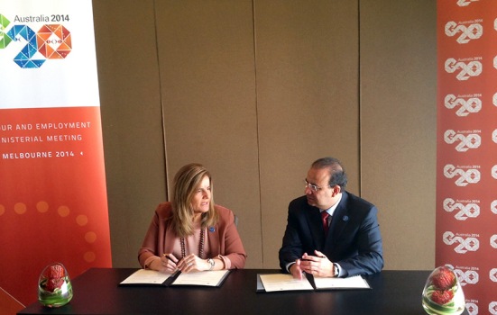 El Secretario del Trabajo y Previsión Social, Alfonso Navarrete Prida, y la Ministra de Empleo y Seguridad Social de España, Fátima Báñez García, firmaron un Acuerdo de Cooperación en materia laboral, en el marco de la Reunión de Ministros de Trabajo y Empleo del G20, que se realiza en esta ciudad.