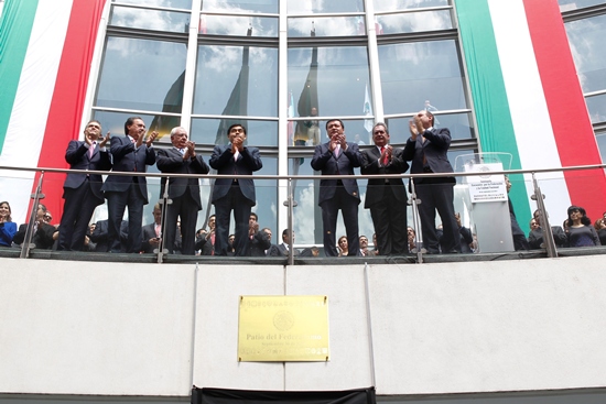 Ante el titular de Gobernación, Miguel Ángel Osorio Chong, quien acudió en representación del presidente Enrique Peña Nieto, los presidentes de la Suprema Corte de Justicia, Juan Silva Meza, y de la Mesa Directiva del Senado, Luis Miguel Barbosa Huerta, develaron la placa “Pacto por Federalismo” en la sede senatorial.