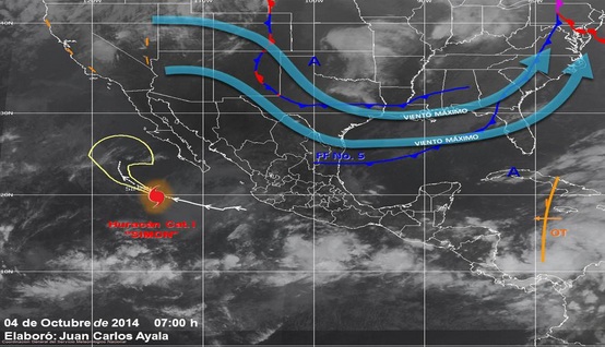 El huracán Simon, categoría I en la escala Saffir-Simpson, se ubicó en las últimas horas, aproximadamente a 500 kilómetros al suroeste de Cabo San Lucas, Baja California Sur, y a 260 km al oeste-noroeste de Isla Socorro, Colima; registra vientos máximos sostenidos de 140 km/hr, rachas de hasta 165 km/hr y desplazamiento hacia el oeste-noroeste a 19 km/hr.