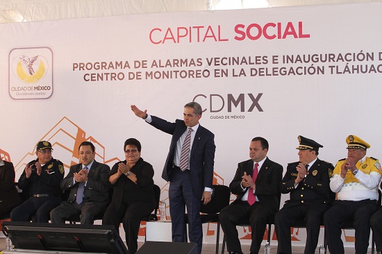 En la delegación Tláhuac, acompañado por la jefa delegacional, Angelina Méndez, los secretarios de Gobierno, Héctor Serrano Cortés; de Seguridad Pública, Jesús Rodríguez Almeida; Mancera Espinosa encabezó la primera entrega de ocho mil alarmas vecinales y cortó el listón inaugural de los edificios Leona Vicario y del Centro de Monitoreo “Base Plata Tláhuac».
