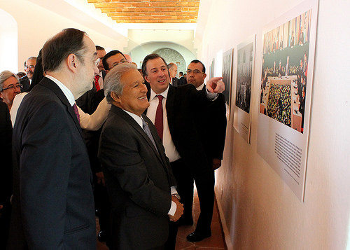 El presidente de El Salvador, Salvador Sánchez Cerén, y el canciller mexicano José Antonio Meade inauguraron la exposición fotográfica y documental alusiva a los Acuerdos de Paz de aquella nación en el ex Colegio de la Santa Cruz de Tlatelolco.