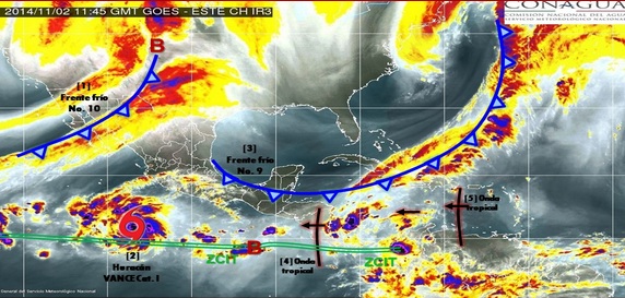 A las 09:00 horas de hoy, tiempo del centro de México, se formó el huracán Vance, con categoría I en la escala Saffir-Simpson, se localizó aproximadamente a 860 kilómetros al sur-suroeste de Manzanillo, Colima, y a 895 km al suroeste de Zihuatanejo, Guerrero; presenta vientos máximos sostenidos de 130 km/h, rachas de hasta 155 km/h y se desplaza hacia el oeste-noroeste a 24 km/h.