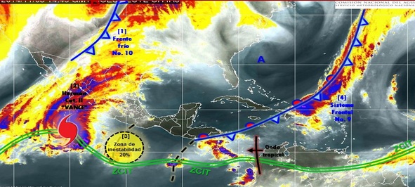 En las costas mexicanas del Pacífico este sistema provocará olas de hasta cuatro metros de altura. Se prevé que mantenga su rumbo al nor-noroeste y por la tarde se podría localizar a 670 kilómetros al suroeste de Cabo Corrientes, Jalisco.