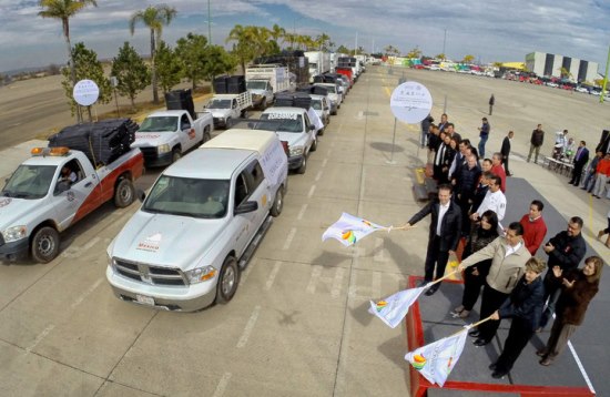 La funcionaria federal y el gobernador de Durango, Jorge Herrera Caldera, dieron el banderazo de salida de tráileres cargados con cobijas y colchonetas para 21 municipios de la entidad, como parte de entrega extraordinaria de recursos del Fondo de Desastres Naturales (Fonden).