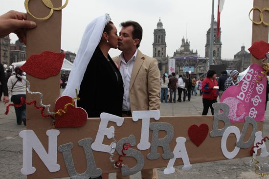En la conmemoración del Día del Amor y la Amistad en la Plaza de la Constitución, el mandatario local deseó a los recién casado «que la pasen muy bien» y «que sean muy felices», entre los que se encontraban adultos mayores, extranjeros, personas con discapacidad y jóvenes, algunos cargaban a sus bebés de meses de nacidos.