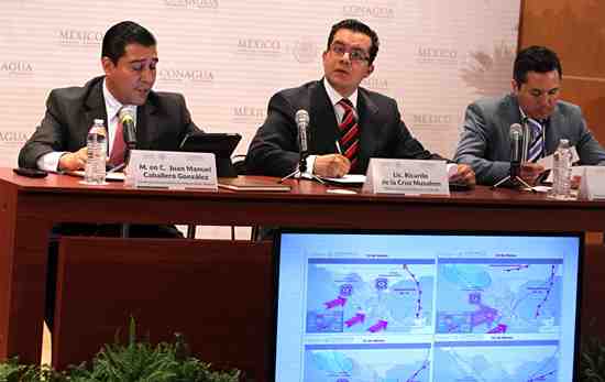 El coordinador general del SMN, Juan Manuel Caballero González, dijo que conferencia de prensa que también se pronostican nevadas en zonas montañosas, granizadas, caída de aguanieve, fuertes ráfagas de viento que pueden ocasionar torbellinos, trombas marinas y tornados.