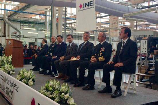 En el acto, los secretarios de la Defensa, Salvador Cíenfuegos; de Marina, Vidal Francisco Soberón y de Gobernación, Miguel Ángel Osorio Chong, fungieron como testigos de honor del arranque de la producción de las boletas para la elección de diputados federales.
