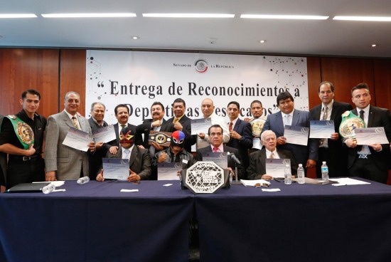 Los senadores Isidro Pedraza Chávez y Luis Sánchez Jiménez rindieron un homenaje a deportistas destacados de lucha libre, box y kick boxing, por su trabajo y dedicación para resaltar el valor del deporte mexicano en el mundo.