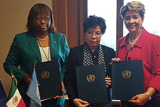 La directora general de la Organización Mundial de la Salud (OMS), Margaret Chan, la directora de la Organización Panamericana de la Salud (OPS), Carissa F. Etienne, y la secretaria de Salud de México, Mercedes Juan, firmaron hoy un convenio de colaboración.