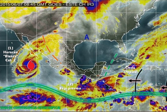 Advirtió que la amplia circulación de Blanca ocasiona desprendimientos nubosos hacia el occidente del país, lo que propicia lluvias puntuales extraordinarias acompañadas de tormentas eléctricas y vientos fuertes en Baja California Sur.
