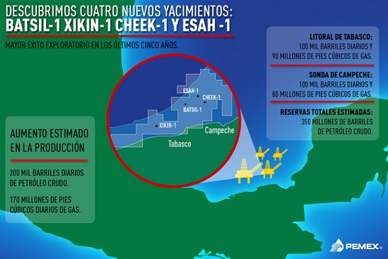 Señaló que tomando en cuenta el corto plazo para su desarrollo y el tamaño de los yacimientos encontrados, estos descubrimientos representan el mayor éxito exploratorio de Pemex en los últimos cinco años después de los yacimientos Tsimin-Xux y Ayatsil.