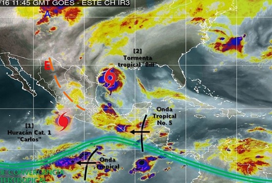 La circulación de Carlos alcanza los estados del occidente y el sur de México, genera potencial de lluvias muy fuertes, acompañadas de tormentas eléctricas en Jalisco y Colima, así como fuertes en Nayarit, Michoacán y Guerrero.