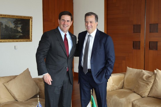 El secretario de Relaciones Exteriores, José Antonio Meade Kuribreña, se reunió este jueves con el gobernador de Arizona, Doug Ducey, en el marco de su visita de trabajo a México.