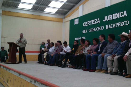 La Secretaría de Desarrollo Agrario, Territorial y Urbano (SEDATU) informa que luego de 73 años de espera, el Gobierno de la República llevó a cabo la titulación formal de una superficie de mil 285 hectáreas, en favor de comuneros del poblado de San Gregorio Macapexco, municipio de Morelos en el Estado de México, con lo que se reconoce la propiedad de los campesinos de este poblado.