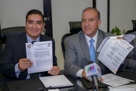 El diputado Luis Alfonso Arana Castro, presidente de la Junta de Coordinación Política de la LVIII Legislatura mexiquense, y Omar Velázquez Ruíz, secretario general del Sindicato Único de Trabajadores del Estado y Municipios (SUTEYM), firmaron el Convenio de Sueldos y Prestaciones Colaterales y de Ley 2015, y reconocieron la relación fortalecida y mutuamente comprometida entre el Poder Legislativo y el SUTEYM, que garantiza un servicio público eficiente, así como el bienestar de los trabajadores.