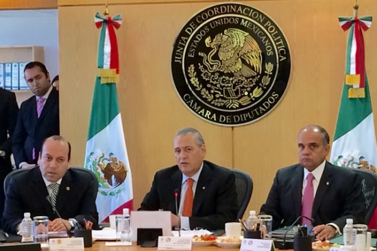 El presidente de la Junta de Coordinación Política de la Cámara de Diputados (Jucopo), Manlio Fabio Beltrones, entregó al secretario general, Mauricio Farah Gebara, los “libros blancos” y discos compactos con la información de los tres años de trabajo de la LXII Legislatura, que darán a los nuevos diputados.