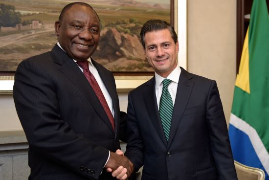 El Presidente Peña Nieto agradeció la visita del Vicepresidente Ramaphosa, quien se encuentra en México por primera vez. Su estancia coincide con el 22º aniversario del establecimiento de las relaciones diplomáticas entre ambas naciones.