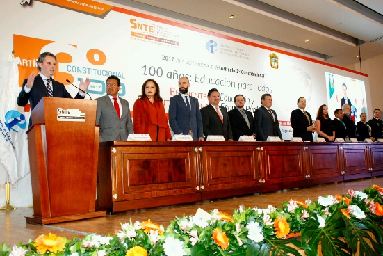 Acompañado por el presidente del Sindicato Nacional de Trabajadores de la Educación (SNTE), Juan Díaz de la Torre, explicó que la educación de calidad se sustenta en la Constitución de 1917, a través del Artículo Tercero, que fue el más debatido, bajo la guía de los principios de una educación pública y laica.