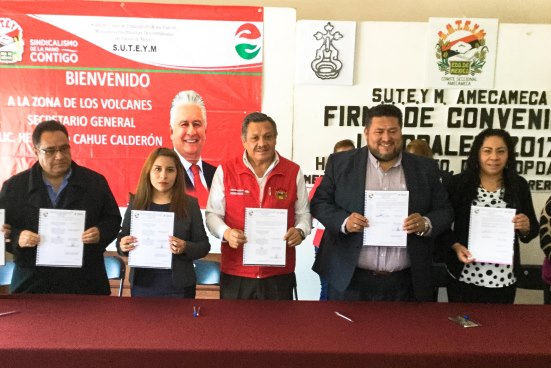 En este tenor, con la representación de Cahue Calderón, Antonio Duarte Franco, Subsecretario de la organización, firmó los convenios de Sueldo y Prestaciones 2017 con alcaldes y autoridades municipales de Temamatla, Tepetlixpa, Amecameca y Ecatzingo.