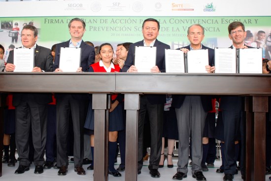 Los secretarios de Gobernación, Miguel Ángel Osorio Chong, de Educación, Aurelio Nuño Mayer; el gobernador de San Luis Potosí, en su calidad de coordinador de la Comisión de Educación, Cultura y Deporte de la Conferencia Nacional de Gobernadores, Juan Manuel Carreras López, así como el presidente del Sindicato Nacional de Trabajadores de la Educación (SNTE), Juan Díaz de la Torre, y el presidente del Consejo de Participación Social en la Educación, Carlos Mancera Corcuera, firmaron el Plan de Acción para la Convivencia Escolar y la Prevención Social de la Violencia entre las secretarías de Gobernación y de Educación Pública.