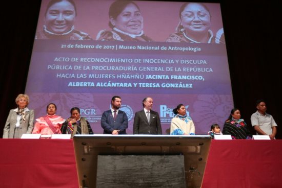 El titular de la PGR, Raúl Cervantes Andrade, encabezó este martes el reconocimiento de inocencia y disculpa pública hacia las mujeres indígenas de la etnia hñáhñú Jacinta Francisco, Alberta Alcántara y Teresa González, quienes fueron detenidas y sentenciadas por el delito de secuestro.