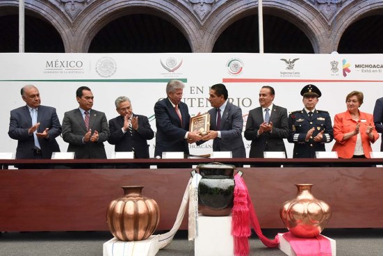 Con la representación del Presidente Enrique Peña Nieto, el titular de la SCT entregó al gobernador de Michoacán, Silvano Aureoles Conejo, el facsímil de la Constitución Política de los Estados Unidos Mexicanos de 1917, ejemplar que se está entregando a cada una de las entidades federativas con motivo del Centenario de nuestra Carta Magna.
