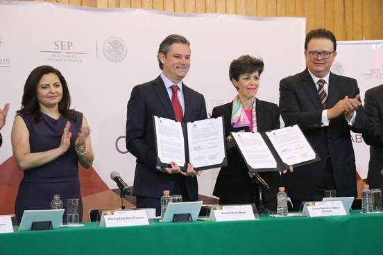 Acompañado por la presidenta del TEPJF, Janine Madeline Otárola, el secretario de Educación Publica explicó que se busca alcanzar una educación de calidad, y para ello se recupera la rectoría del Estado en materia educativa; se impulsa la profesionalización de los maestros, con evaluaciones que permiten que en las aulas estén los mejores; se reorganizan las escuelas para que tengan mayor autónoma de gestión y menos carga burocrática, y se cambia el Modelo Educativo, que es el corazón de la transformación de la educación, para romper las barreras de desigualdad.